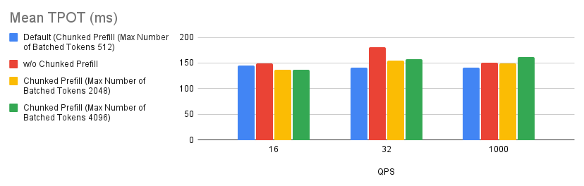 - In our experiments we found that the prefix caching hit rates of Bar 3 (yellow) and Bar 4 (green) are around 0.9% and 50%. Based on the comparison of Bar 3 (yellow) and Bar 4 (green) with the baseline and Bar 2 (red), this tells us that if the user requests do not have high prefix caching hit rate, disabling both chunked prefill and prefix caching might be considered a good rule of thumb.