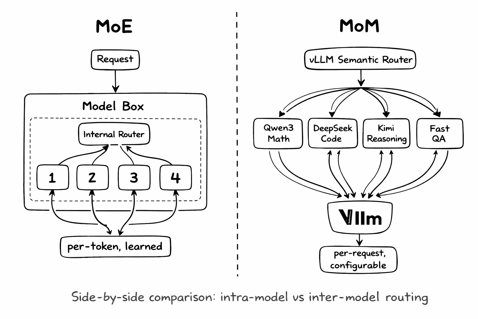 MoE is an architecture pattern inside a single model. Models like Mixtral, DeepSeek-V3, and Qwen3-MoE use sparse activation—for each token, only a subset of “expert” layers are activated based on a learned gating function.