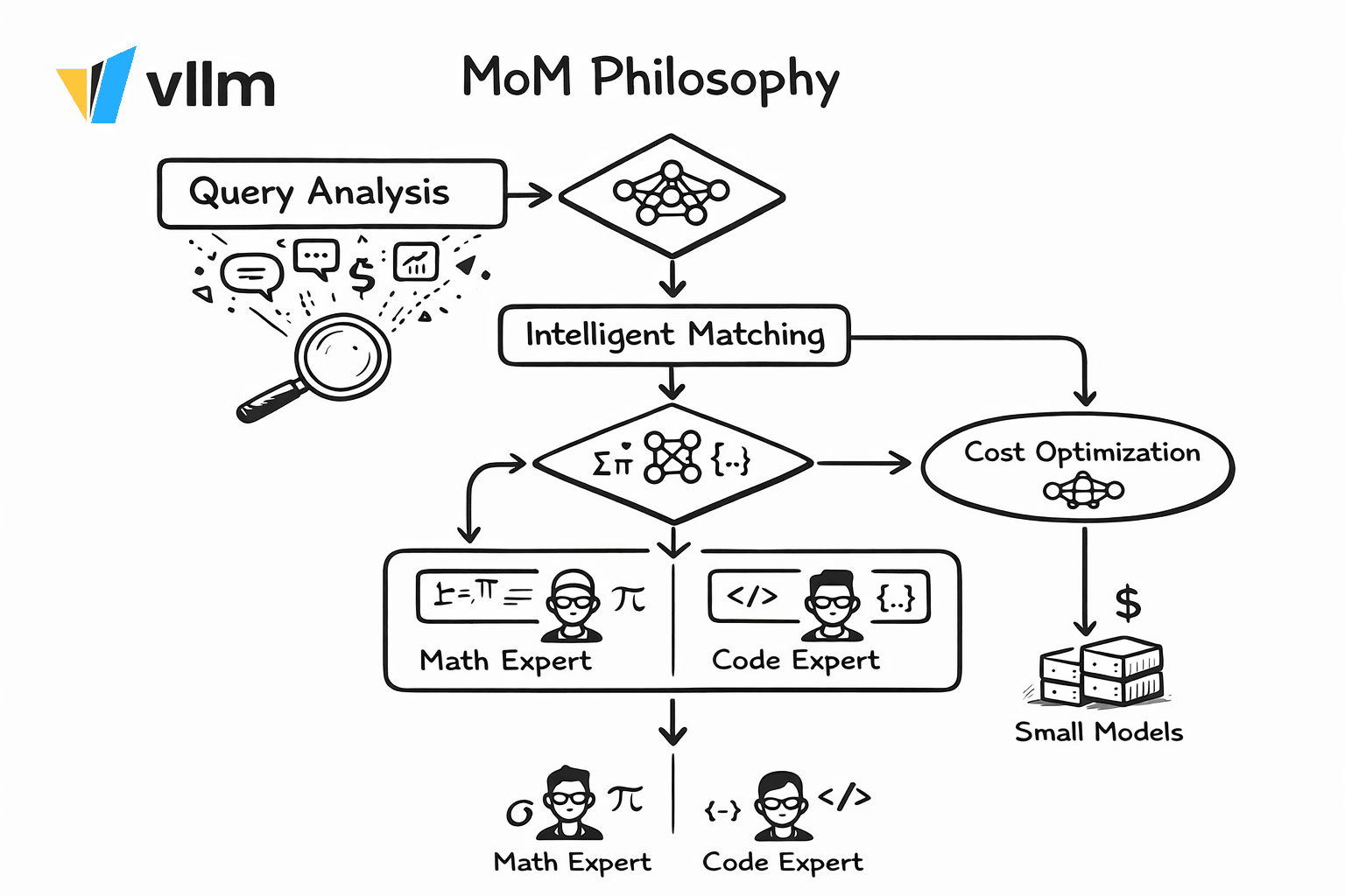 MoM treats AI deployment like building a team of specialists with a smart dispatcher: